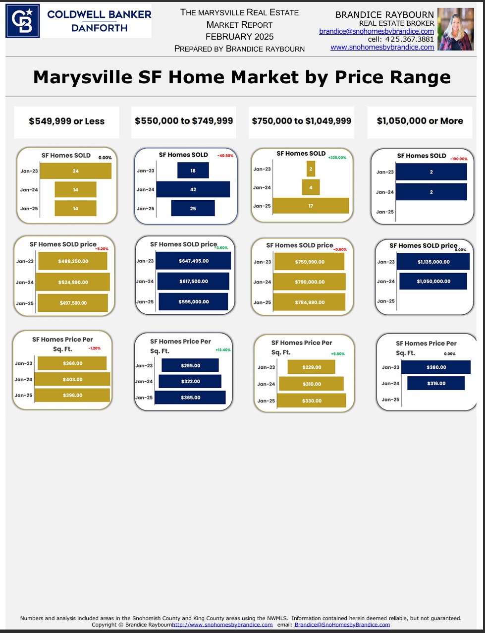 Higher priced homes above 1.05M saw fewer transactions, which is typical for Marysville since that price level represents a smaller portion of the local housing inventory.