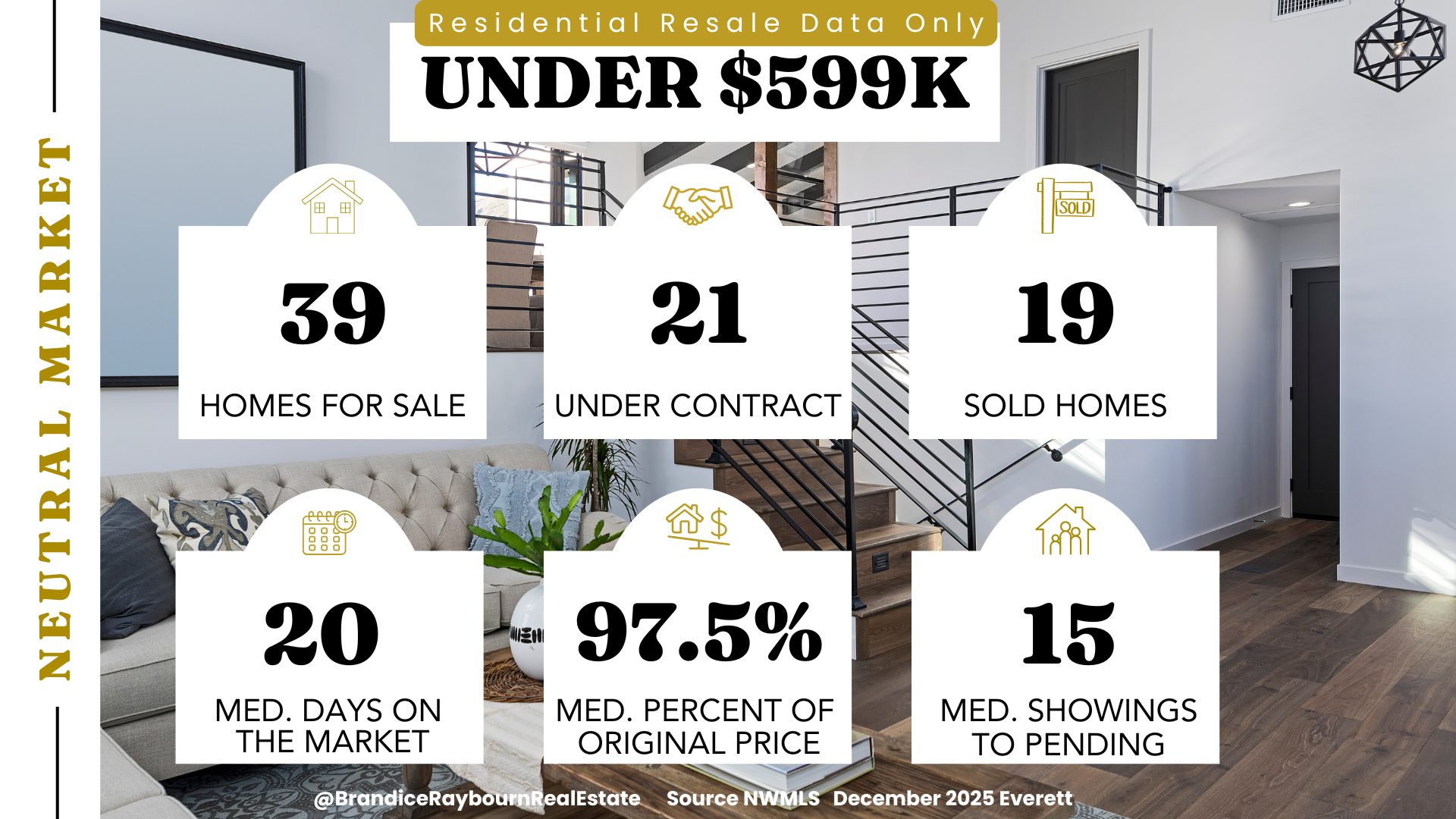 The under 599K range in Everett has definitely softened. Most of what hits the market here are older detached homes, fixers, and dated ramblers, with a few newer condos and townhomes mixed in. Buyers are picky, and it shows. Homes are still selling, but the pace is slower and buyers are taking their time, negotiating more, and waiting for the right fit. This range feels neutral and leans a little buyer friendly.